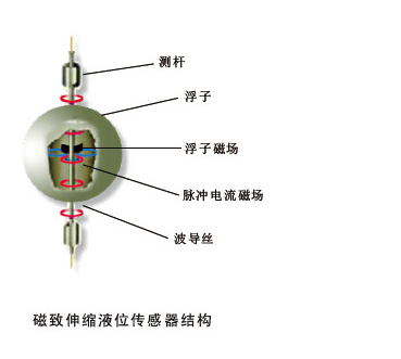 磁致伸縮液位傳感器的結(jié)構(gòu)部分由不銹鋼管(測(cè)桿)、磁致伸縮線(波導(dǎo)絲)、可移動(dòng)浮子(內(nèi)有永久磁鐵)等部分組成,見(jiàn)圖。